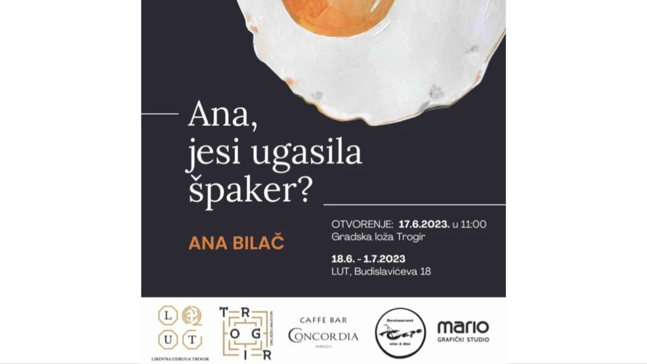 S uzbuđenjem vas pozivamo na otvaranje izložbe „Ana, jesi ugasila špaker?“ akademske slikarice Ane Bilač koje će se održati 17. lipnja 2023. u 11 sati u Gradskoj loži u Trogiru! Otvaranju će pridonijeti sa pjesmom Ženska klapa Mindula, iz Okruga Gornjeg.