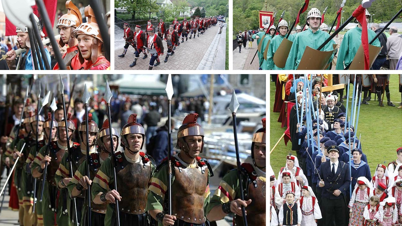 Prva skupina su šimunaši, njih četvorica, oni prate Šimuna Cirenca tijekom procesije. Oni su odjeveni u žute haljine, a imaju kacige na glavi. Nose koplja sa sječivom, mačeve i štitove. Drugu skupinu čine baldakinaši. Oni nose baldahin pod kojim ide svećenik. Odjeveni su u crvene haljine. Treća skupina su gardisti. Oni su najbrojniji, ima ih 12, a stupaju strogim vojničkim korakom. I oni su odjeveni u crvene haljine s prslucima, nose kacige bez perjanice, koplja te o pojasu mačeve. Svaku od skupina predvode vođe odjevene u ljubičaste haljine s kacigama ukrašenima perjanicama, a u ruci nose mač ili buzdovan i štit.