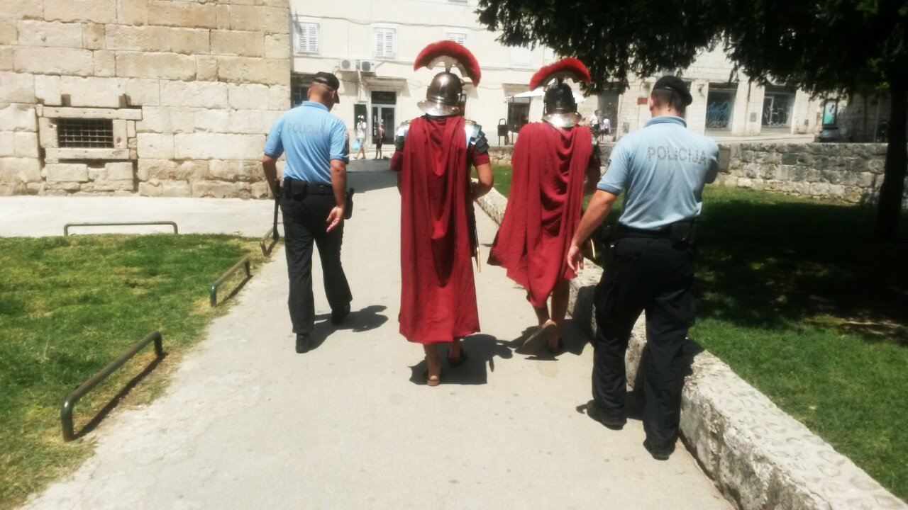 U najužem dijelu grada, na samom Peristilu, policajci su u petak priveli dvojicu rimskih legionara. Legionari su privedeni oko 11:30 sati, pred šokiranim Splićanima i brojnim turistima, a uhićeni su zbog sumnje da nezakonito obavljaju djelatnosti na Peristilu.