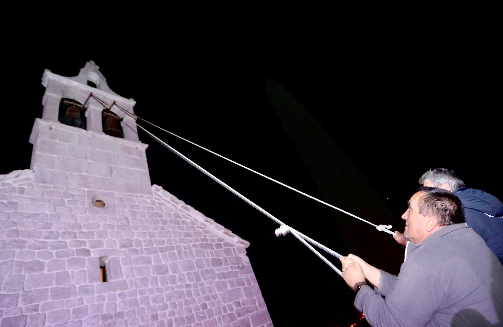 Na nešto više od osam metara visine dva su zvona, ‘muško’ teže s južne strane zvonika i ‘žensko’ nešto kilogramima lakše sa sjeverne strane zvonika. Muško je teško 220, a žensko 140 kilograma. Onaj jezičak unutar zvona je težak 12 kilograma. I kako krenu u šest sati poslijepodne kad pada noć, ne prestaju brecati sve do u zoru Dušnog dana.