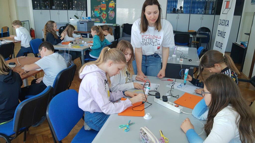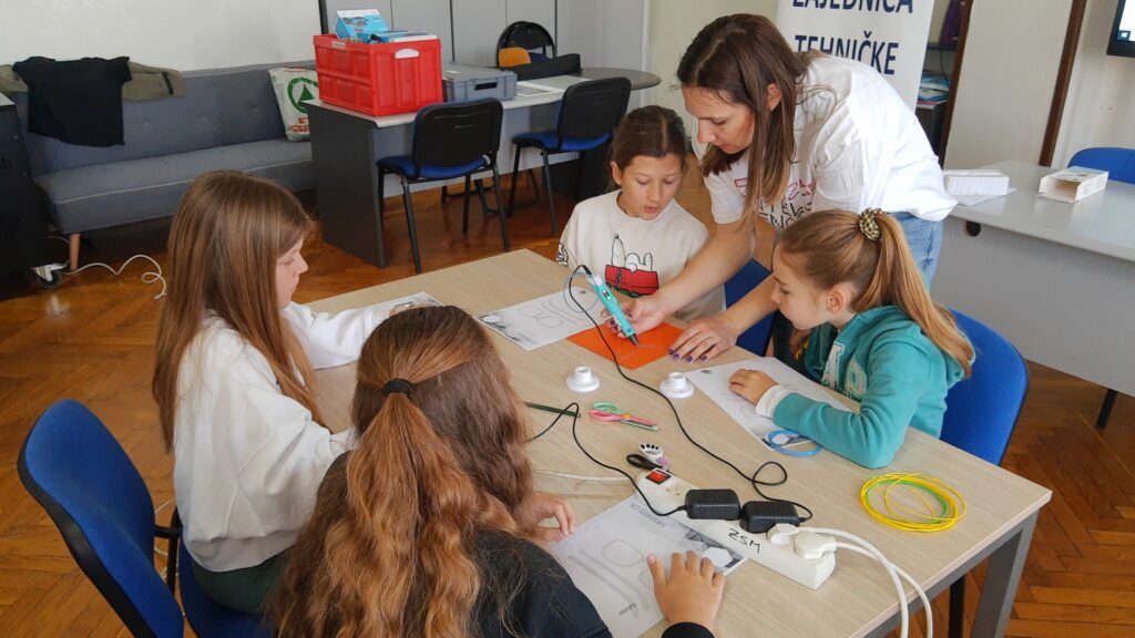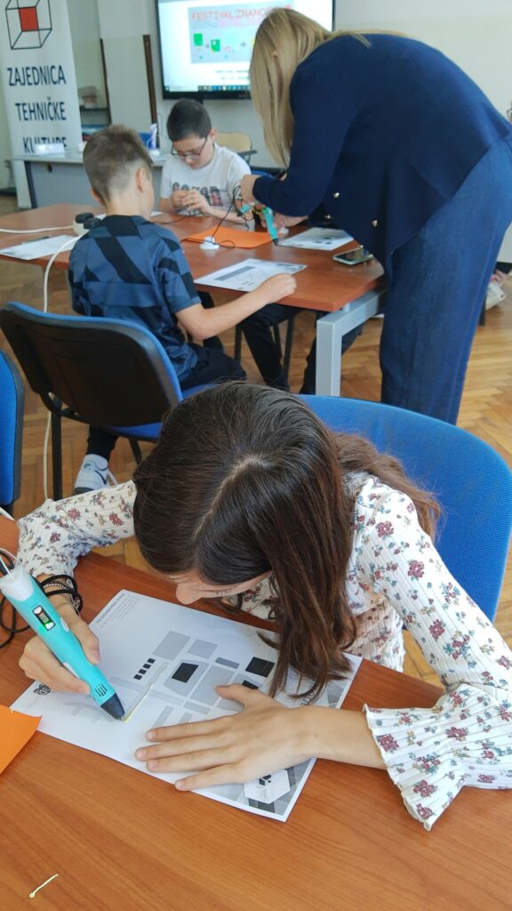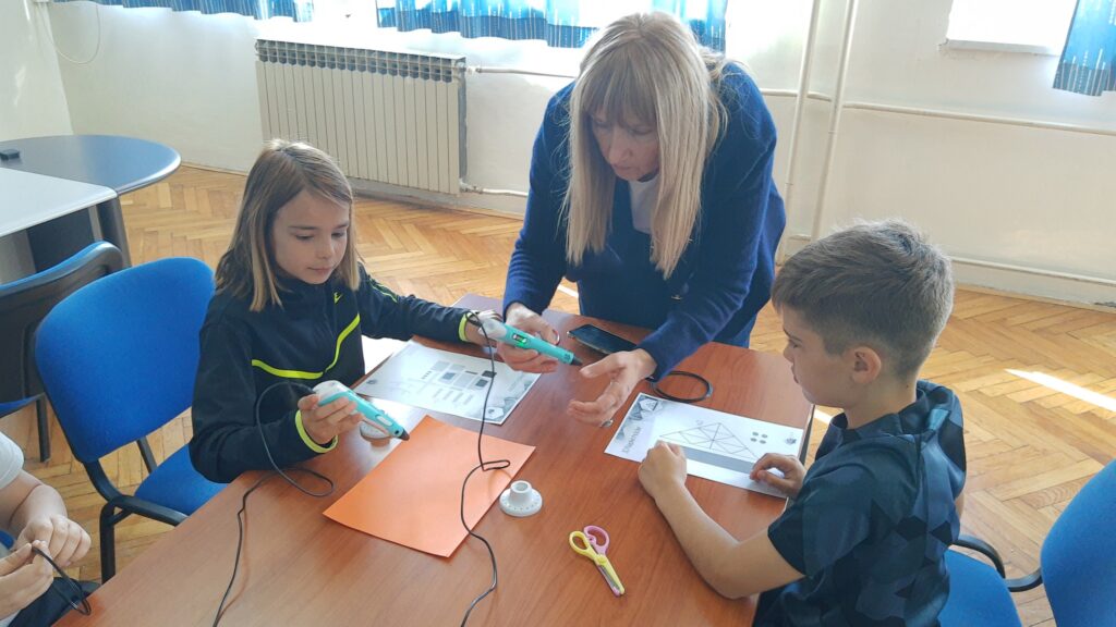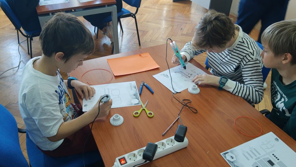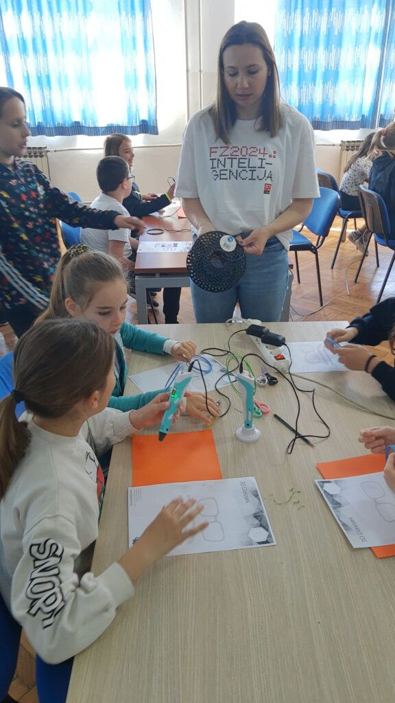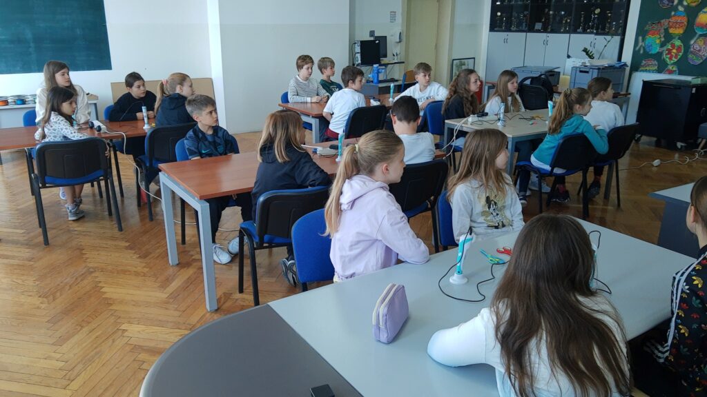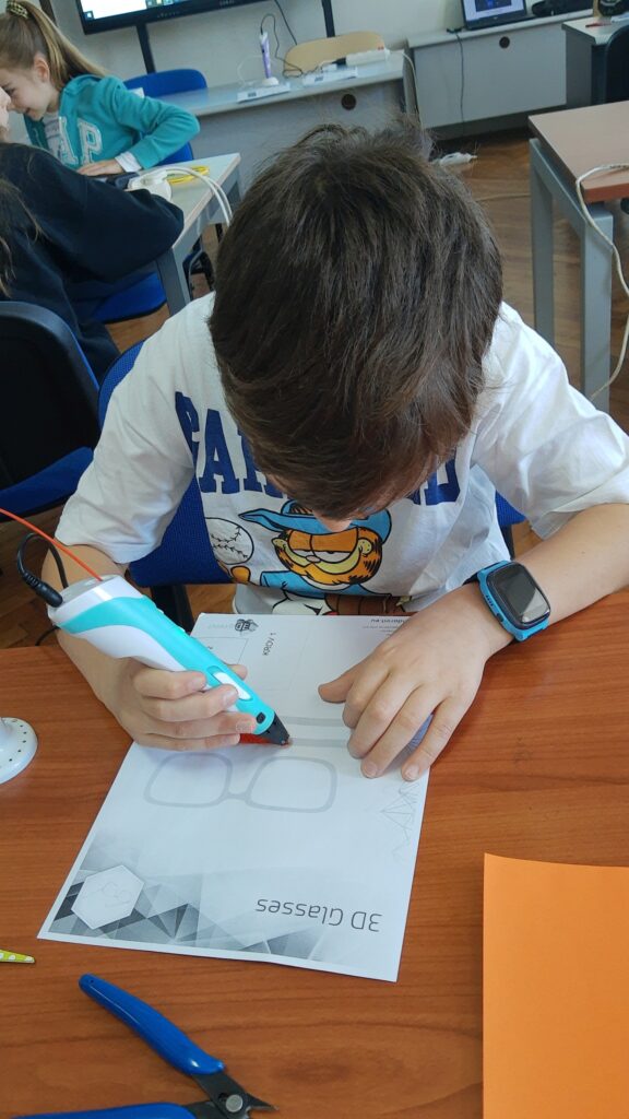 Na radionici modeliranja 3D olovkom učenici su upoznali tehnologiju za 3D modeliranje, mogućnosti primjene i postupke pri korištenju iste te su pomoću 2D predložaka oblikovali 3D modele i tako razvijali maštu, kreativnost, inovativnost i tehničke kompetencije! Modelirali su obične naočale, naočale s krunom, pandu, helikopter, zrakoplov, držač za ubruse i leptira. Na radionici je sudjelovalo 19 učenika četvrtih razreda.