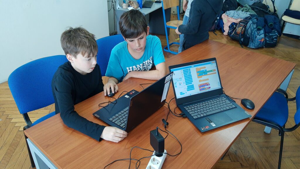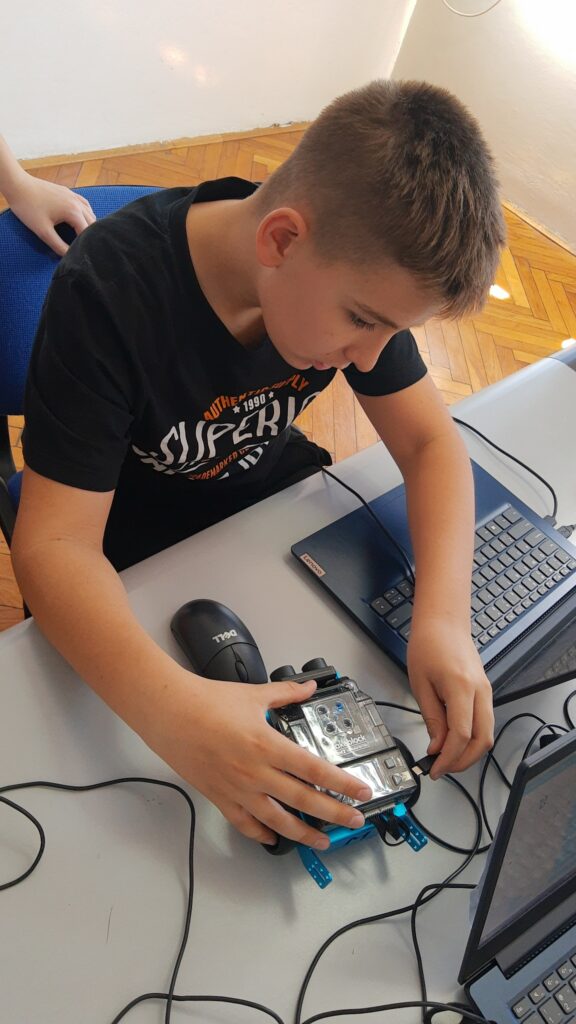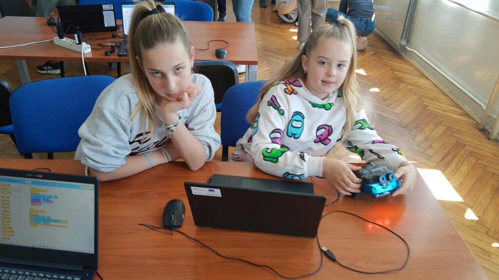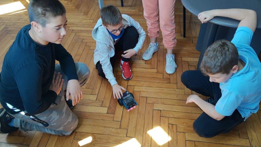 Sljedeća održana radionica je radionica robotike, u kojoj su učenici programirali u mBlocku i na taj način pokretali robote mBot2. Osim osnova programiranja blokovima, naučili su programirati i robotski senzor za izbjegavanje prepreka. Na radionici robotike sudjelovala su 24 učenika petih razreda.