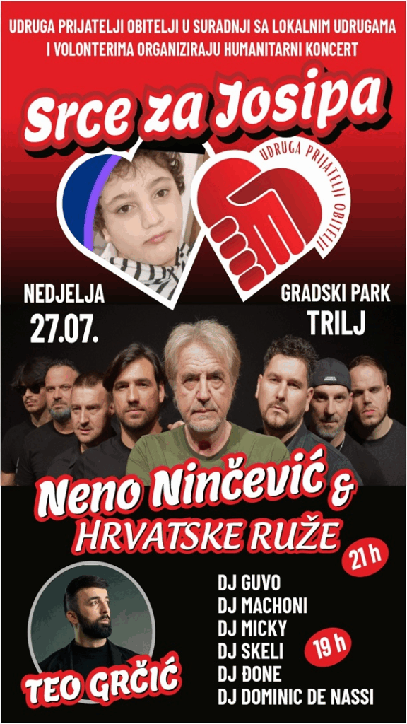Kako bi se prikupila sredstva za nastavak njegovog liječenja, Udruga “Prijatelji obitelji’” uz podršku volontera i lokalnih udruga, organizira humanitarni koncert “Srce za Josipa”. Pozivaju se sve udruge, obrtnici, OPG-ovi i ljudi velikog srca da svojim dolaskom podrže ovu akciju i pokažu da zajedno možemo pomicati granice mogućeg.