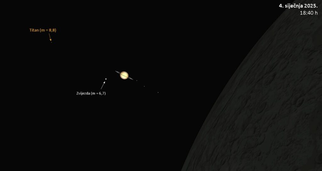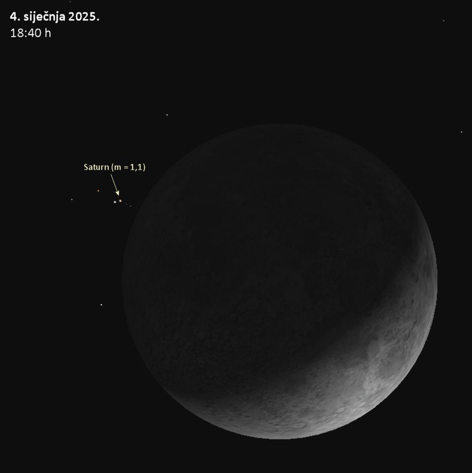 Kako je prognoza za subotu povoljna, vrijedi najaviti okultaciju Saturna Mjesecom koja će se za nas zbiti ove subote (4. siječnja), u večernjim satima. Tamna strana Mjesečevog diska će početi pokrivati Saturnov prsten u približno 18:47 h. Cijeli Saturn i njegov prsten će se naći iza Mjeseca oko dvije minute kasnije. Nakon još približno 8 minuta, bit će pokriven i Titan, najveći Saturnov mjesec. Pojava će se moći vidjeti i prostim okom, ali će dobro doći i kakav mali dalekozor. – javili su iz Zvjezdano selo Mosor.