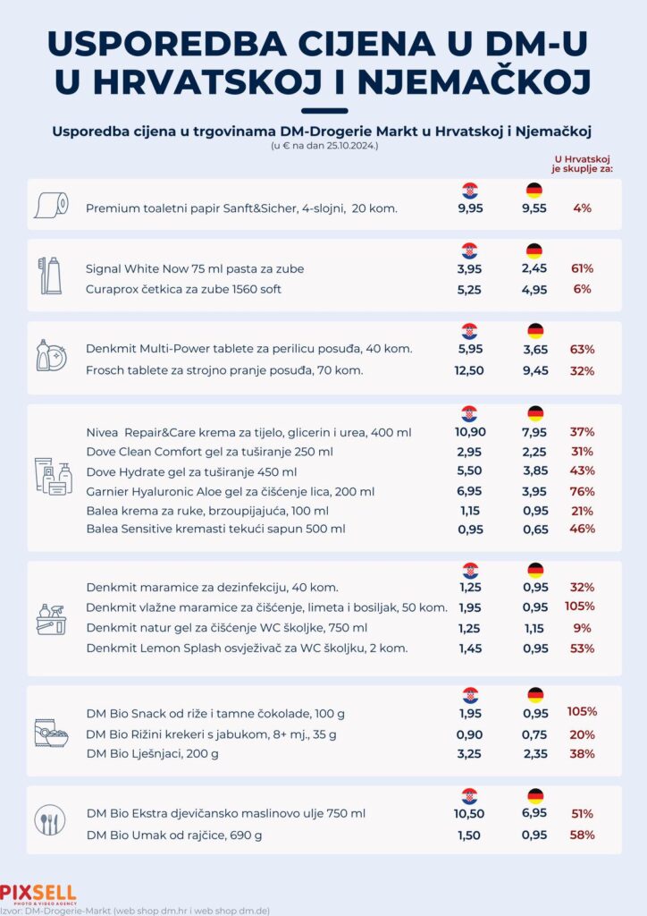 Prema nedavno objavljenim podacima agencije Pixsell, razlike u cijenama proizvoda drogerijske mreže dm između Hrvatske i Njemačke predmet su intenzivne rasprave, s iznenađujućim rezultatima koji pokazuju da su cijene u Hrvatskoj znatno više. Analiza koja je obuhvatila usporedbe različitih proizvoda otkrila je da su troškovi osobito visoki kod proizvoda za njegu i čišćenje. Primjerice, gel za čišćenje lica u Hrvatskoj košta čak 76 posto više nego u Njemačkoj, dok je cijena tekućeg sapuna skuplja za 46 posto.