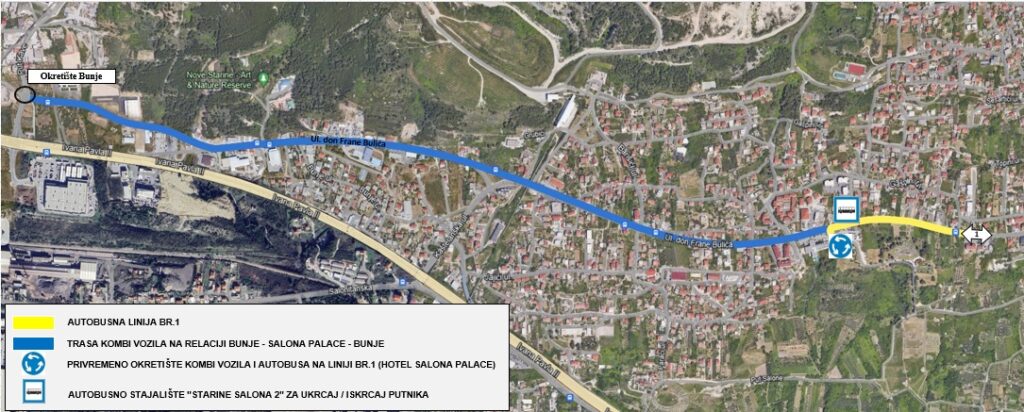 Zbog navedenog će autobusi na liniji br.1 do završetka gore navedenih radova kao okretište koristiti lokaciju gdje je privremeno izgrađeno (samo za vrijeme radova) autobusno okretište kod Hotela Salona Palace, dok će za ukrcaj i iskrcaj putnika biti na raspolaganju autobusno stajalište u Ulici don Frane Bulića, naziva “Starine Salona 2”.