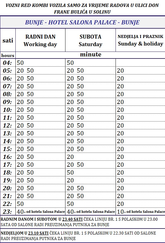 Kako bi se stanovnicima Bunja i putnicima iz zone radova osigurala što bolja povezanost, izvođač radova angažirat će kombi vozilo koje će polaziti s Bunja 10 minuta ranije u odnosu na polaske koji su navedeni u voznom redu linije br.1, a prometovat će do privremenog okretišta kod Hotela Salona Palace i obratno, gdje će putnicima sa područja gdje se izvode radovi biti omogućeno presjedanje (u polasku i dolasku) tj. korištenje autobusa na liniji br.1 koji će prometovati po uobičajenom voznom redu.
