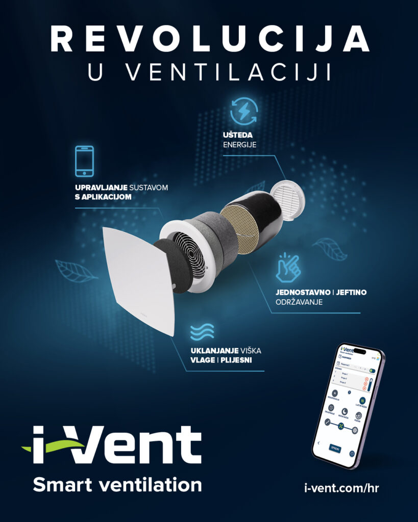 Upoznajte I-Vent ventilacijski sustav s rekuperacijom – pametan sustav ventilacije koji unosi svjež zrak, izbacuje vlagu i zagađenja, čuva toplinu prostora i štedi energiju.