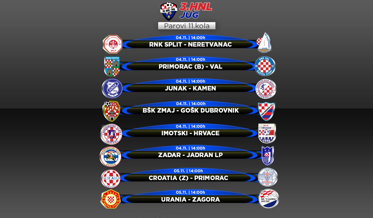 Danas i sutra na rasporedu je 11. kolo 3.HNL jug a već gotovo pa tradicionalno šest utakmica na rasporedu je subotom od 14 sati a preostale dvije igraju se u nedjelju također u 14 sati. Vodeća momčad lige, biogradski Primorac na svom stadionu dočekuje posljednju momčad lige, kaštelanski Val, kojem unatoč pojačanjima nikako da krene.