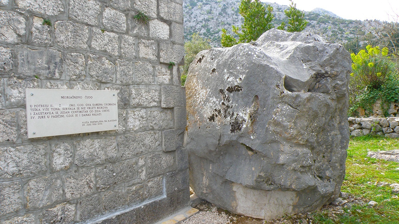 Tada su se velike kamene gromade odvaljivale s čitavog područja Biokova i padale po kućama, cestama i nezaustavljivo rušile sve pred sobom. Jedna takva kamena gromada odvalila se s područja brda Rilić i zakotrljala prema crkvi svetog Jure u Pasičini. Radilo se o velikoj kamenoj gromadi teškoj nekoliko desetaka tona. Gromada se nezaustavljivo survala meljući sve pred sobom. Zaustavila se tek kod crkve svetog Jure, jedan centimetar od vanjskog zida. Jedan jedini centimetar!